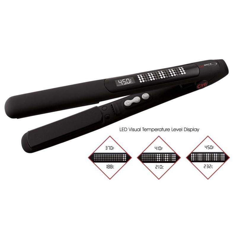 CHI Onyx Euroshine Hairstyling Iron has an advanced ion generator that works in conjunction with the onyx ceramic plates to produce two times more ions for noticeably smoother and shinier results. Four inch extended iron plates feature beveled rounded tips offering seamless rotation for maximum styling versatility and ease of use. The additional plate length also quickly and easily styles long hair types. In addition, an LED neon light bar clearly displays temperature settings for easily recognizable and customizable temperature selection per hair type, texture and desired style.