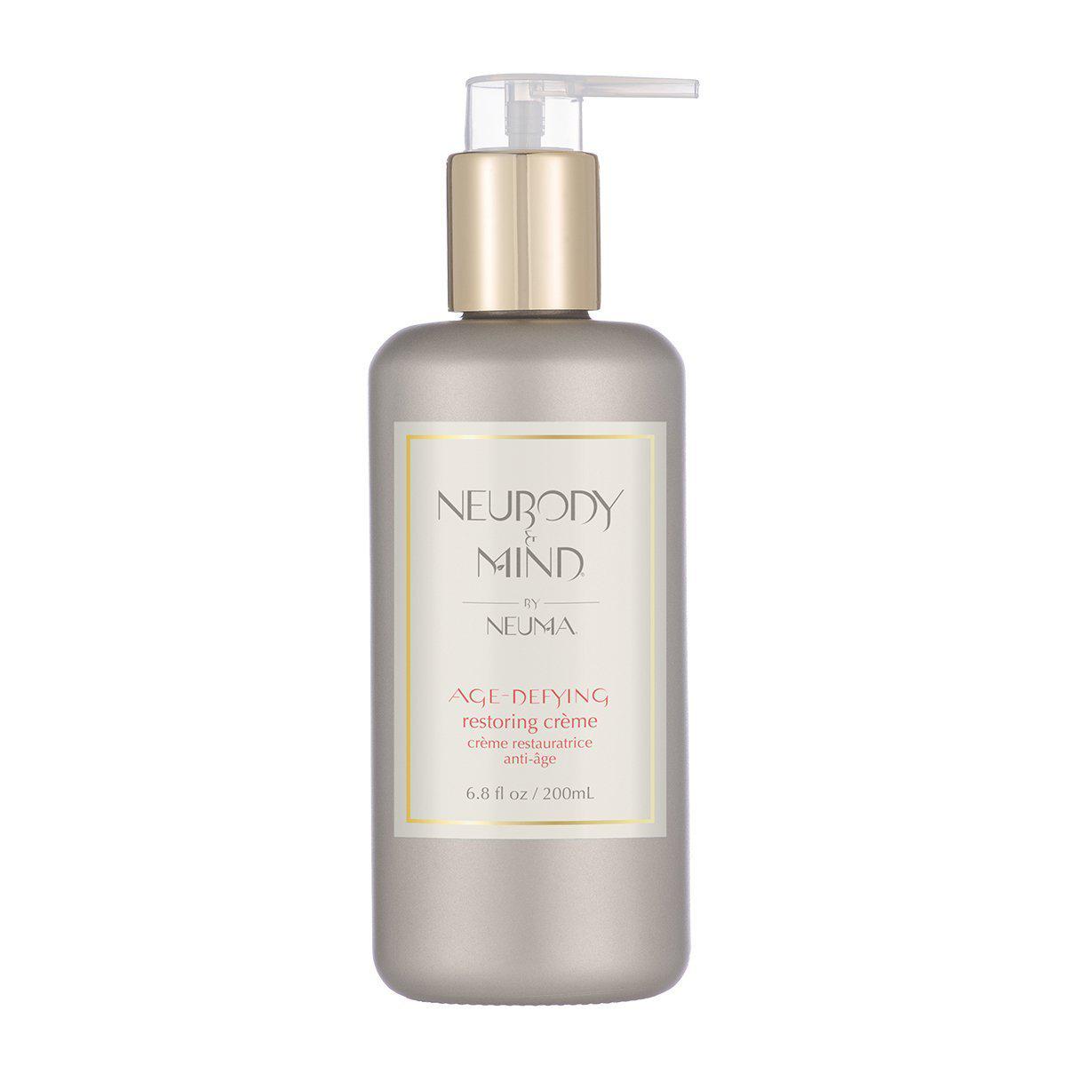 neuBody & Mind age-defying restoring créme helps skin retain its moisture and helps restore skin elasticity for a more youthful appearance. The fast-absorbing body cream leaves skin feeling silky smooth, featuring soothing aromas of frankincense, myrrh and hibiscus.